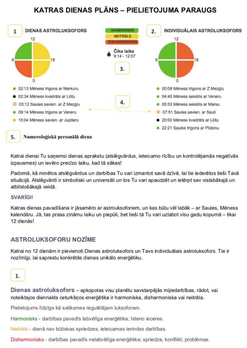 Katra no šīm dienām ir saistīta gan ar kādu no Zodiaka zīmēm, gan ar kādu dzīves jomu. Attiecīgi domājot un rīkojoties šīs zīmes simbolos un atslēgvārdos, gan vairāk tās iepazīsi, izprotot zīmes raksturu un īpatnības, gan izrādīsi tām labvēlību. Tas ļaus Tev ar gandarījumu teikt: "Es izdarīju visu, kas manos spēkos, lai līdzsvarotu sevi un pasauli ap sevi." Tu raidīsi Kosmosā labvēlības zīmi, kas nepaliks bez ievērības.