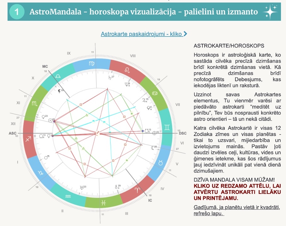 Ļoti svarīgi ir pēc jeburuas sadaļas iepazīšanas paraudzīties uz ASTROKARTI = ASTROMANDALU - tas ir kā Tava astroloģiskā dzimšanas brīzā fotoattēls, kurā viss iekodēts um kura skatīšana dod vajadzīgo AStroVeiksmes navigāciju dzīvei.