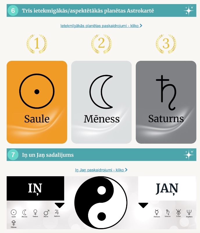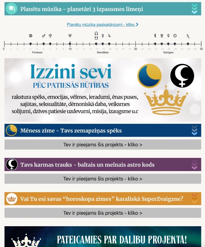 Savukārt, ja interesē vairāk skaidrojoši tieši Tava rakstura plusi un ēnas puses - tad papildus jāiegādājas Mēness zīmes un Melnā Mēnesss/Lilitas projekti. Bet Karaliskās Saules projekts pacels Tavu pašapziņu un uzrādīs cik daudz Tev ir karaliski zvaigžņoti “asiņu”.