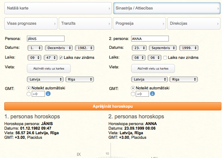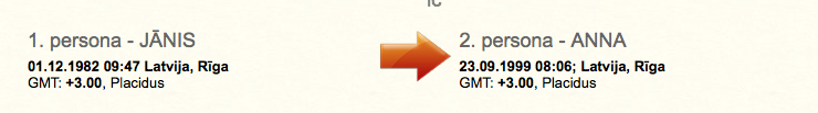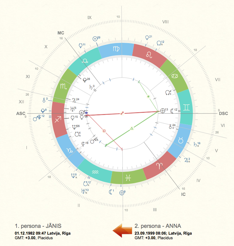Ar šo rīku Tu sagatavosi vizuāli modernas sinastrijas kartes jebkuru divu personu saderībai – abu personu natālās kartes un abpusējas sinastriskās kartes, kas ir ļoti pārskatāmi un atvieglos saderības analīzi, jo savienot priekšstat vienotā veselumā visērtāk, ja visi nepieciešamie dati ir redzami vienkopus! Sagatavojot katras personas grafisko datu analīzi, Tu saņemsi vispilnīgāko informāciju kā par katru personu individuāli.
