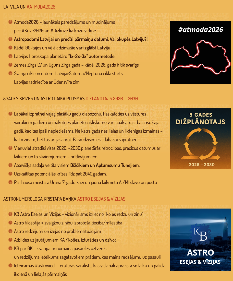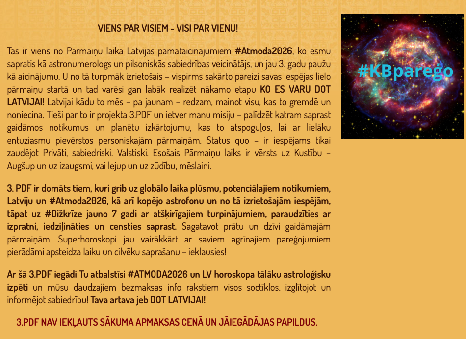 Ar iegādi Tu atbalsti #ATMODA2026 un LV horoskopa tālāku astroloģisku izpēti un mūsu daudzajiem bezmaksas info rakstiem visos soctīklos, izglītojot un informējot sabiedrību! Tava artava jeb DOT LATVIJAI!