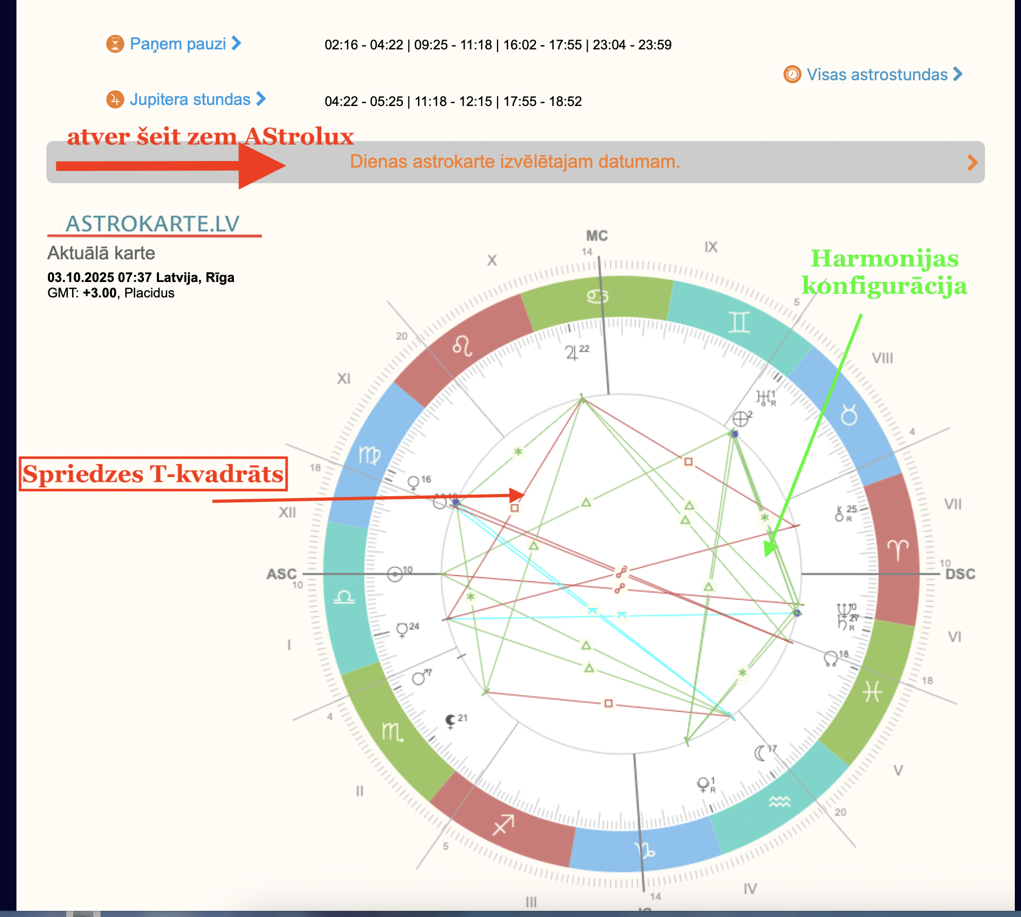 ASTROVIP.LV var lieliski redzēt un izlasīt katras dienas aspektus. Ja tas apgūts var spert soli krietni tālāk un saredzēt ASTROKARTE.lv piedāvātās figūras, kuras tur var aktuālajā dienas kartē izklikot katrai dienai vai arī konkrētai dienai skatīt atspoguļojumu uz Saullēkta laiku (nosaka dienu) arī Dižkalendārā.